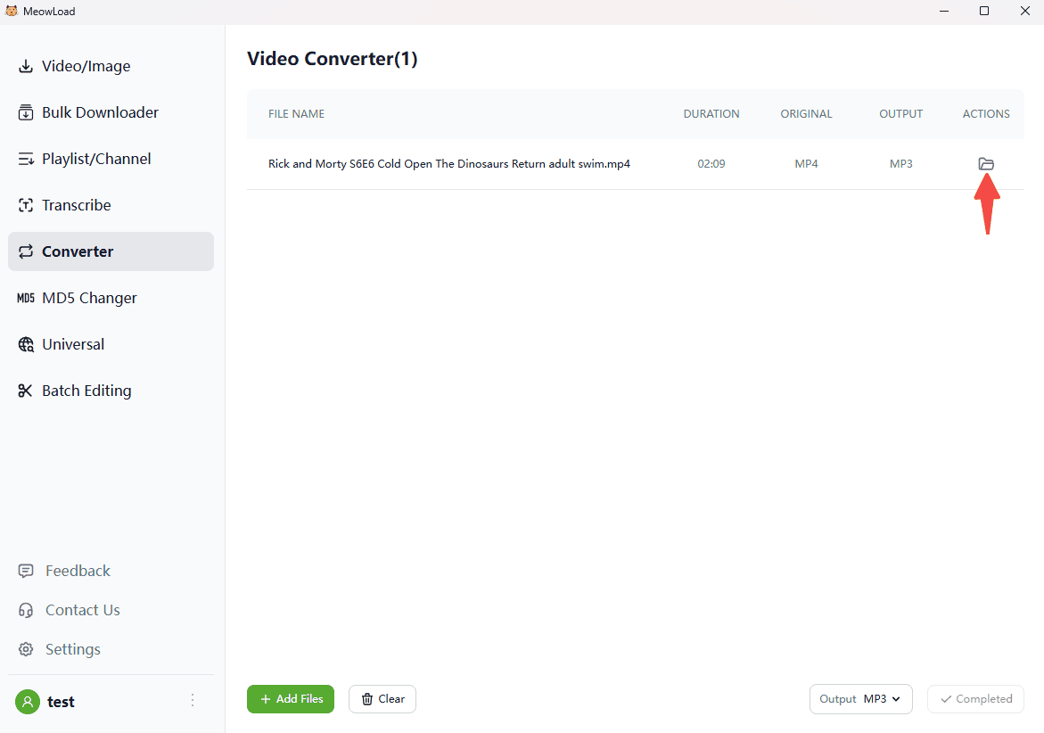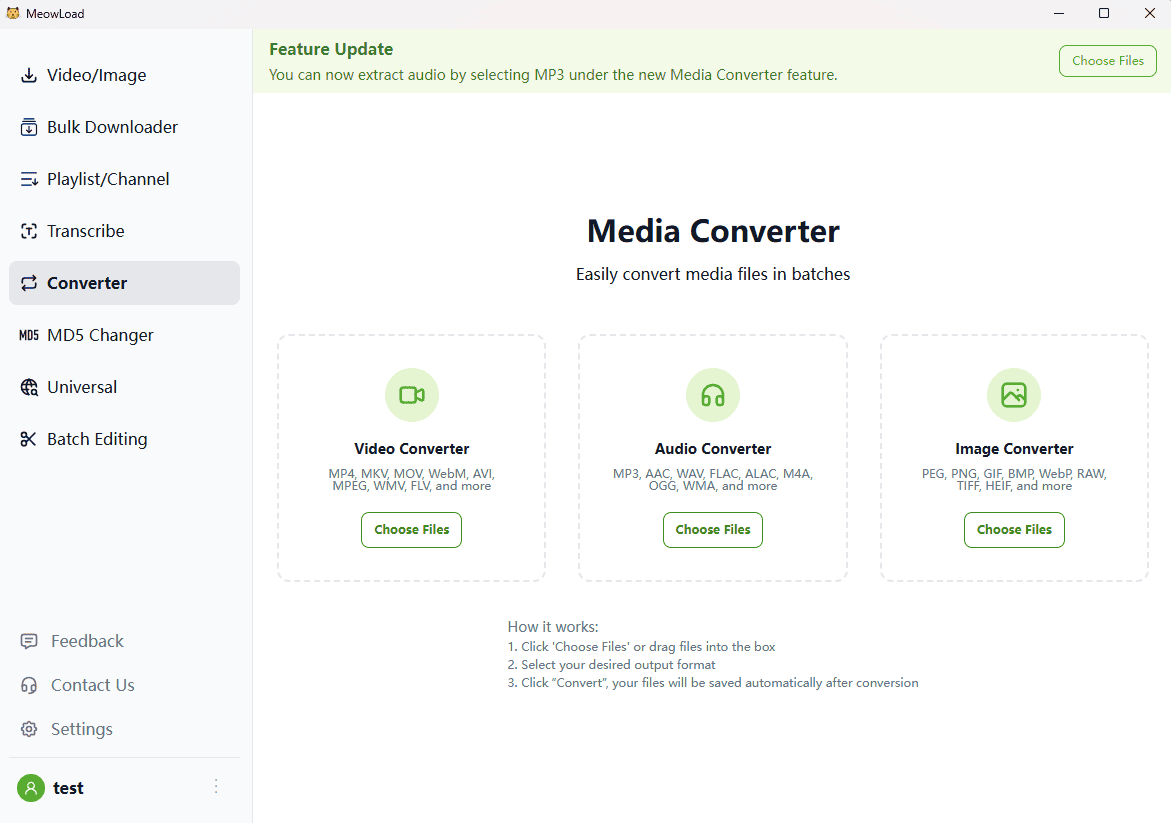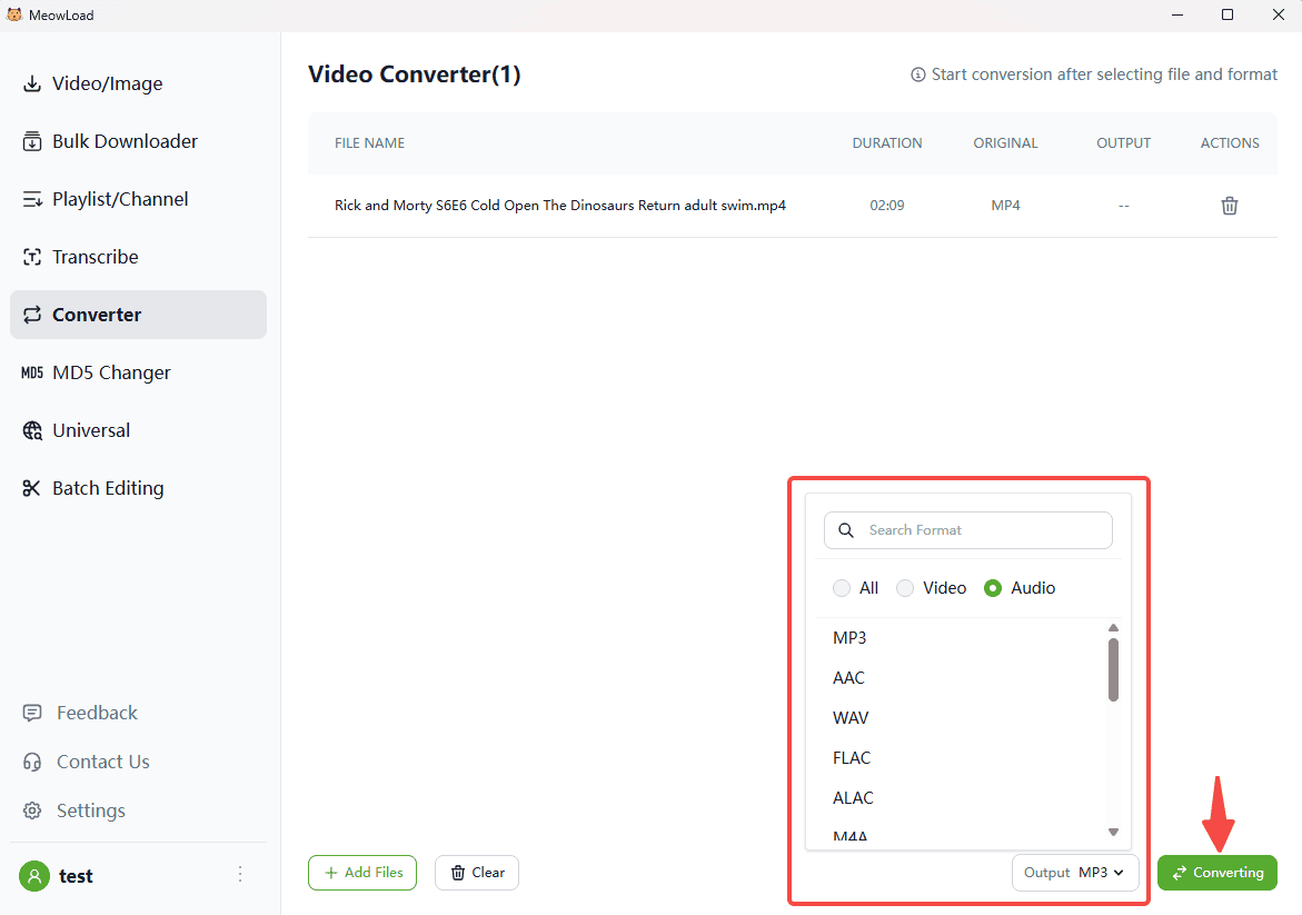 ¿Tienes problemas para abrir formatos de vídeo descargados? ¿O deseas convertir vídeos a audio para escucharlos en podcasts? MeowLoad cuenta con un potente motor de conversión integrado que permite cambiar fácilmente entre formatos de vídeo, audio e imagen sin necesidad de instalar software adicional.